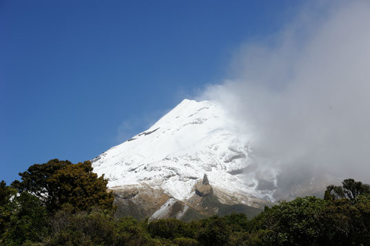 Der Taranaki ist mit 2.518 Metern der zweithöchste Berg der Nordinsel. Sein Vulkankegel ist so idealtypisch ausgebildet, dass er im Film "Last Samurai" als Ersatz für den Fuji diente. Um den Berg herum befindet sich der Egmont Nationalpark. Als Vulkan war der Taranaki zuletzt im 17. Jahrhundert aktiv. In den Jahrtausenden davor ist der Berg regelmäßig zusammengebrochen und bei neuen Ausbrüchen wieder erstanden. Dabei hat er die Halbinsel geschaffen, die heute die Region Taranaki bildet.