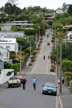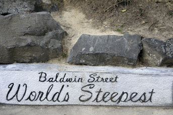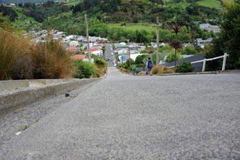 Zurück in Dunedin begutachteten wir zunächst die Baldwin Street. Diese ist laut Guinessbuch mit 38% die steilste Straße der Welt.
