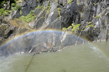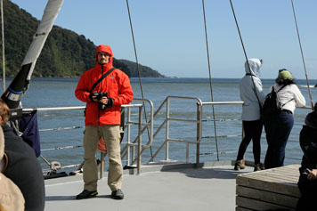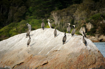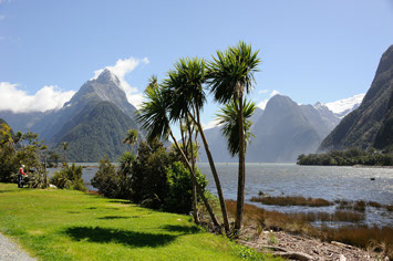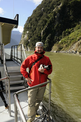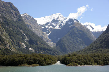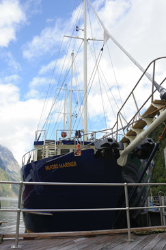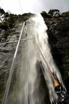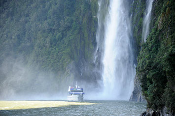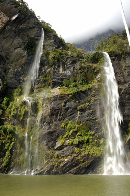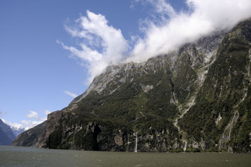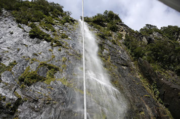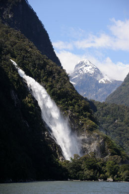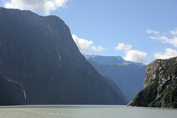 Im Milford Sound ging es dann per Schiff im Fjord bis zur Einmündung in die Tasmansee. Unterwegs konnten wir bei bestem Wetter das beeindruckende Bergpanorama, mehrere Wasserfälle, Pinguine und Pelzrobben beobachten. Interessant ist auch die Vegetation an den steilen und felsigen Bergflanken. Dort wachsen viele kleine Bäume und Büsche. Nur 20% der Bäume sind mit ihren Wurzeln in den Felsen verankert. Der restliche Bewuchs ist mit dem Wurzelwerk nur an den "Ankerbäumen" angedockt. Da es kaum Erde gibt, die Wasser speichern könnte, überleben die Pflanzen nur wegen der gewaltigen Niederschlagsmengen im Fjord (Durchschnitt: 6.000 mm im Jahr, Rekord ca. 14,5 m!!).