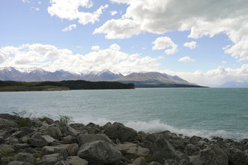 Vom Rande des Lake Pukaki konnten wir einen Blick auf die Kulisse der Southern Alps werfen. Der Mt. Cook, der höchste Berg Neuseelands, war leider hinter dichten Wolken verschwunden.